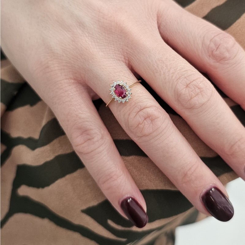 Gioiello da Donna realizzato in oro giallo 750 (18KT) - L’anello, valorizzato da un delizioso zircone rosso taglio ovale, è impreziosito da un contorno di scintillanti zirconi bianchi - Misura Anello: 12 - Peso: 1,70 grammi.