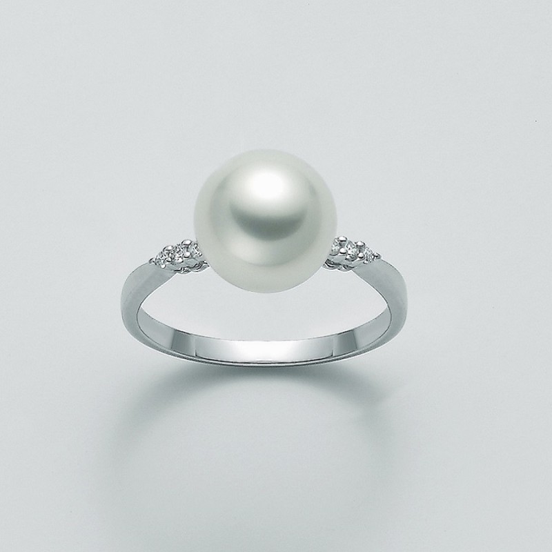 Gioiello da Donna della collezione NIMEI PERLE AUSTRALIA realizzato in oro bianco 750 (18KT) - L’anello è impreziosito da una perla bianca Australia coltivata di acqua salata dal diametro di 9,5-10 mm valorizzata ai lati da sei diamanti taglio brillante per una caratura complessiva di 0,055 ct - Diamanti G color - Garanzia Internazionale: 24 Mesi.