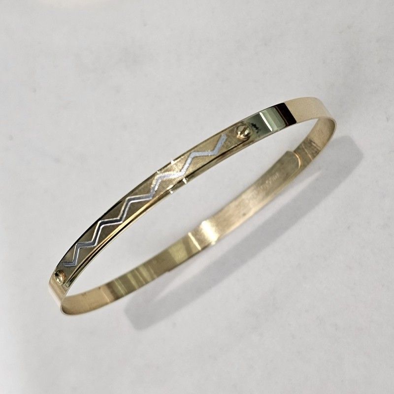 Il bracciale, modello rigido, è caratterizzato da una lavorazione lucida ed impreziosito al centro con una lavorazione ad onda in oro bianco 750 (18kt).