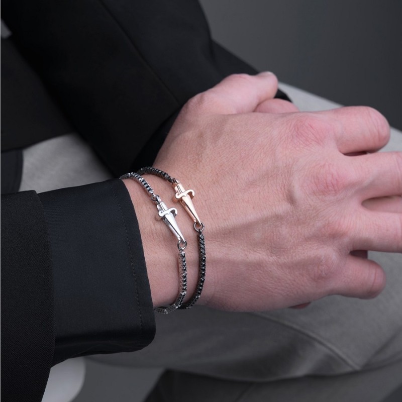 Gioiello da Uomo CESARE PACIOTTI realizzato in argento 925 placcatura rodio black - Il bracciale, modello Tennis, è impreziosito con una fila di eleganti zirconi neri dal diametro di 2,0 mm e valorizzato al centro da uno spadino in argento 925 placcatura oro rosa, simbolo iconico del brand, che funge anche come chiusura - Premendo leggermente su un lato dello spadino, lo stesso si solleva leggermente per fare in modo che possa essere inserito l’anelletto che chiude il bracciale - Lunghezza Bracciale: 19 cm.