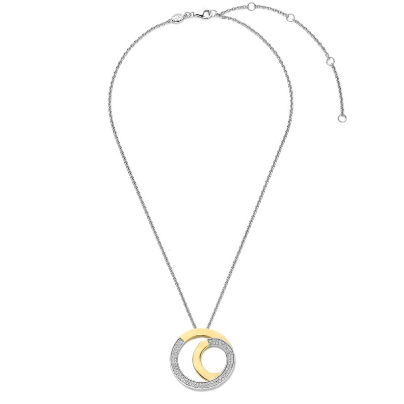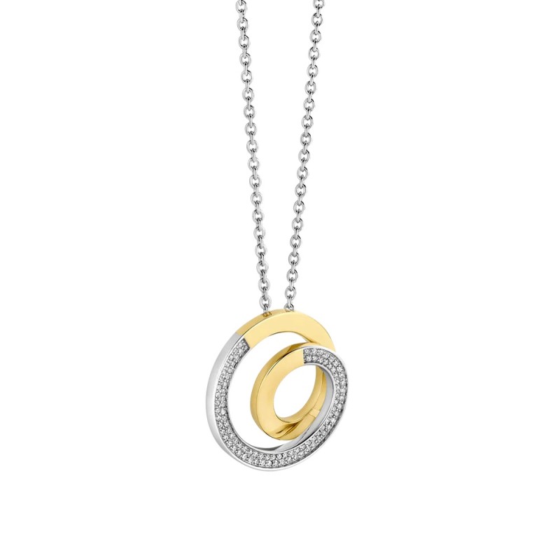 Gioiello da Donna TI SENTO MILANO realizzato in argento 925 placcatura in platino - La collana, caratterizzata da una maglia catena modello rolò, è impreziosita da un pendente formato da due cerchi intrecciati di cui uno valorizzato da una radiosa placcatura in oro giallo e l’altro da un pavé di luminosi zirconi bianchi - Chiusura con moschettone - Lunghezza Pendente: 2,45 cm - La lunghezza standard della collana è 38 cm - L'estensione di 10 cm, in dotazione, consente di poterla indossare in altre quattro diverse lunghezze: 40, 42, 45 e 48 cm - Garanzia Internazionale: 24 Mesi.