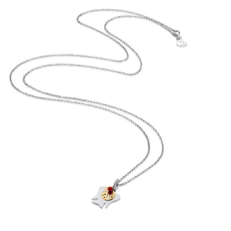 La collana è in argento 925/°°° rodiato con pendenti angelo, coccinella in argento 925/°°° con placcatura oro giallo e charm di corallo rosso. Lunghezza 90 cm. Collezione Argento Porte-Bonheur.