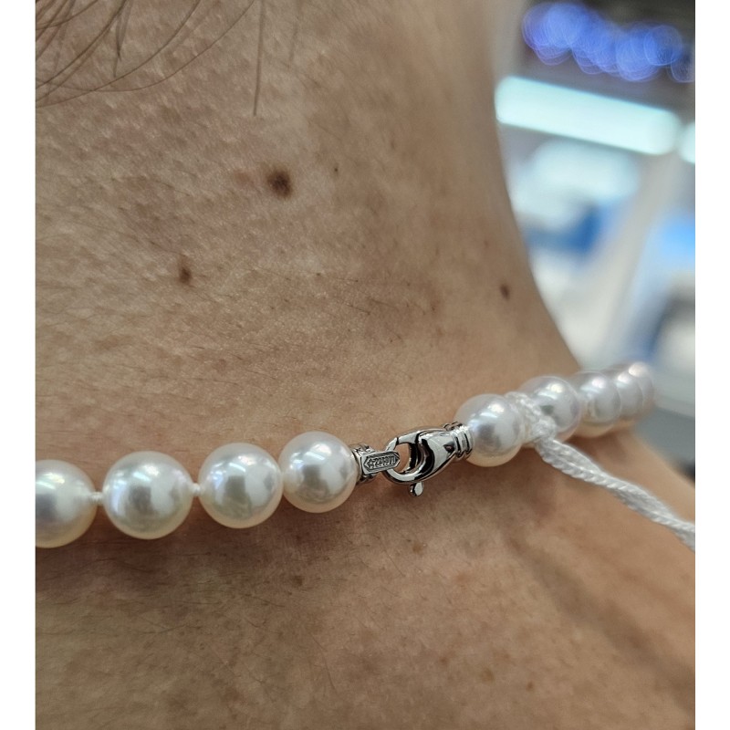 Gioiello da Donna della collezione NIMEI PERLE AKOYA realizzato con perle bianche Akoya coltivate di acqua salata dal diametro di 7-7,5 mm - La collana è valorizzata da una chiusura con moschettone in oro bianco 750 (18KT) - Lunghezza Collana: 46 cm - Garanzia Internazionale: 24 Mesi.