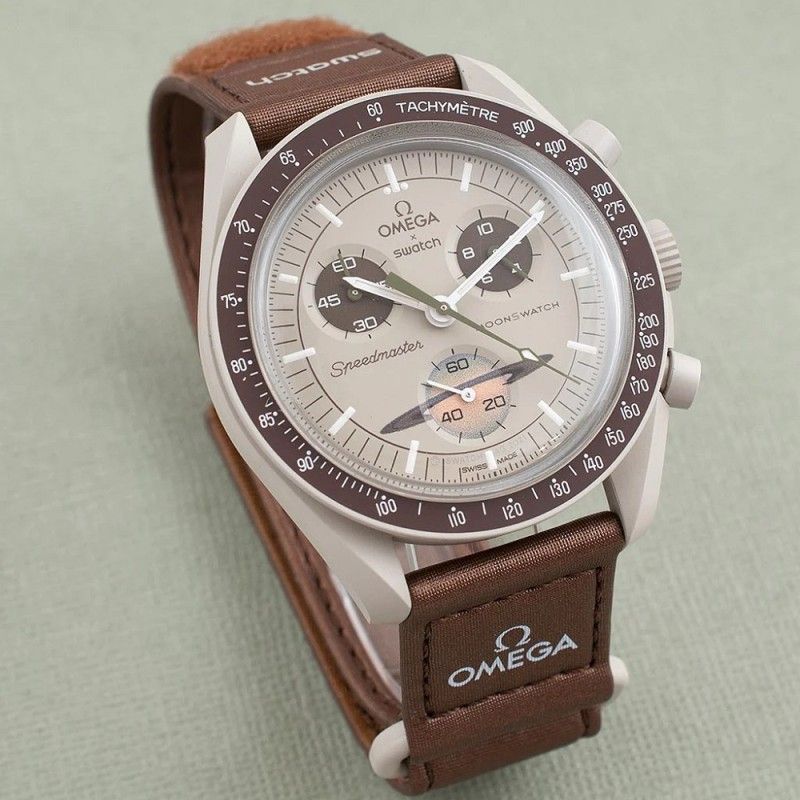 Orologio cronografo da Uomo della collezione Mission to Saturn del brand SWATCH x OMEGA con movimento Swiss Made al quarzo, cassa 42 mm in bioceramica color sabbia, quadrante analogico beige e ghiera marrone.