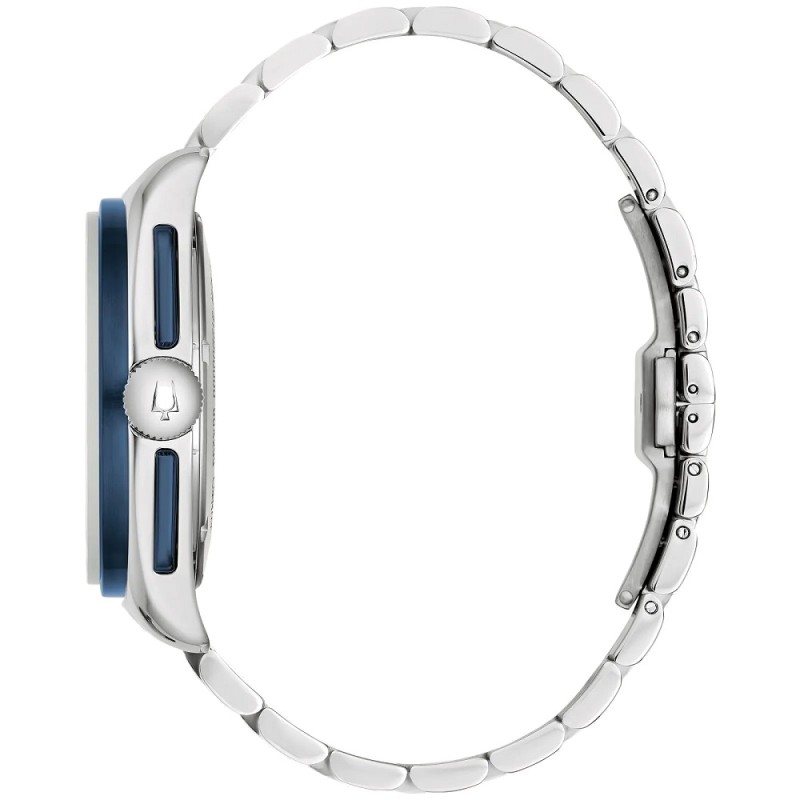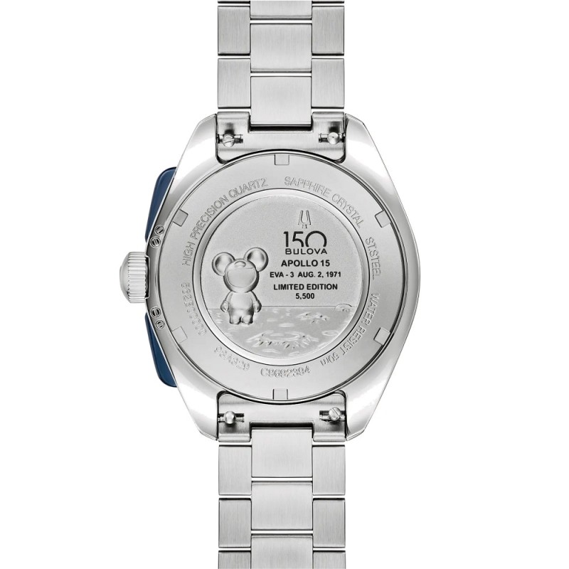 Orologio cronografo da Uomo BULOVA della collezione LUNAR PILOT TIMASCUS BUDII 150° ANNIVERSARY LIMITED EDITION con movimento al quarzo High Precision 262 kHz, cassa 43 mm in acciaio inox, spessore della cassa 13.50 mm, ghiera con scala tachimetrica di colore blu, quadrante analogico Timascus realizzato in titanio pregiato attraverso il processo Damasco e contatori silver, indici e lancette con inserto luminescente in modo che l'ora sia leggibile anche in condizioni di scarsa illuminazione, fondello numerato individualmente con impresso il simbolo Budii, simbolo distintivo di Rosinhole e vetro zaffiro con trattamento antiriflesso - Il cinturino è in acciaio inox con finitura lucida e satinata e monta una chiusura deployante con apertura a doppio pulsante - Orologio impermeabile a 5 ATM, quindi può tollerare piccole immersioni, ma non la pressione dell'acqua (come nella doccia o durante un tuffo) - Garanzia Internazionale: 60 Mesi.