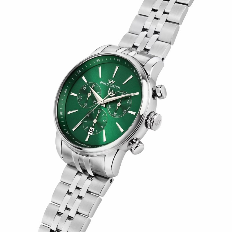 Orologio PHILIP WATCH cronografo da Uomo della collezione ANNIVERSARY con movimento al quarzo SWISS MADE, cassa 40 mm in acciaio inox, spessore della cassa 10.75 mm, quadrante analogico verde, indici a bastoni e lancette di colore silver, datario con finestrella ad ore 6, fondello serrato a vite per una maggiore garanzia di impermeabilità e vetro minerale - Il cinturino è in acciaio inox finitura lucida e satinata e monta una chiusura déployante con apertura a doppio pulsante - Orologio impermeabile a 10 ATM, quindi è adatto per il nuoto e le immersioni, ma non è adatto per le immersioni con pressione.