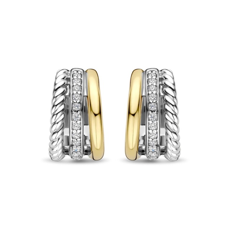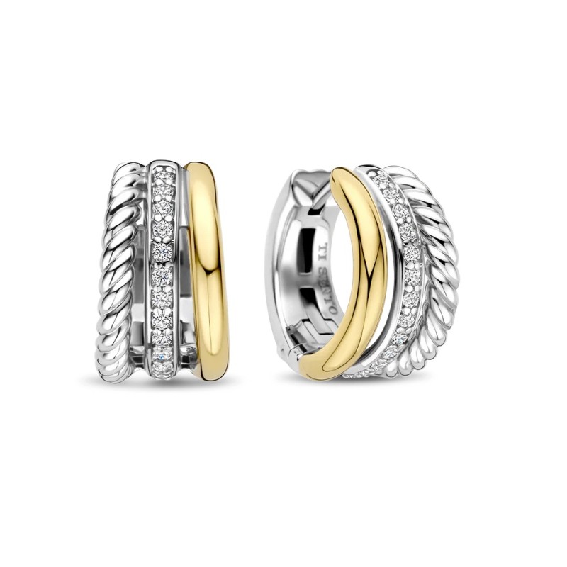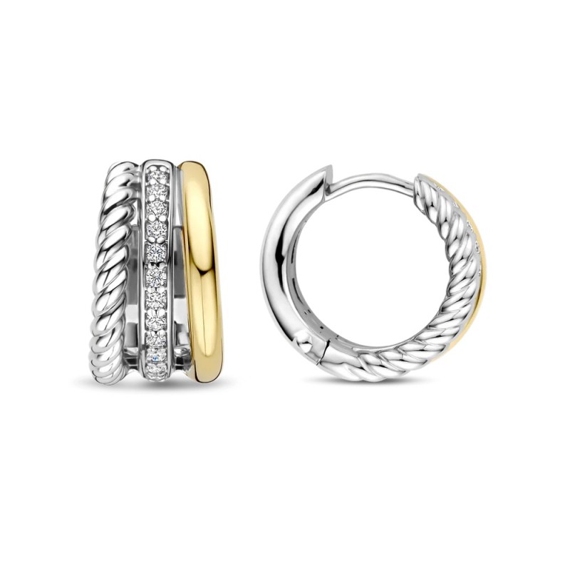 Gioiello da Donna TI SENTO MILANO realizzato in argento 925 placcatura in platino - Gli orecchini modello a cerchietto, sono caratterizzati da tre file di cui una con finitura intrecciata, una con finitura lucida e placcatura in oro giallo ed una, centrale, impreziosita con luminosi zirconi bianchi - Diametro esterno dell'orecchino: 1,40 cm - Diametro interno dell'orecchino: 1,00 cm - Larghezza Orecchini: 8,5 mm - Chiusura con perno a scatto - Garanzia Internazionale: 24 Mesi.