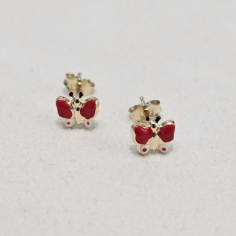 Gioiello da Bambina realizzato in oro giallo 750 (18KT) - Gli orecchini, caratterizzati dalla forma di una farfalla, sono impreziositi con smalto di colore rosso e bianco - Chiusura con perno e farfallina - Dimensione Farfalla: 0,5 cm - Peso 0,50 grammi.