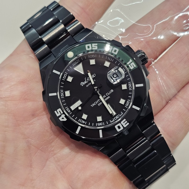 Orologio solo tempo da Uomo PAUL PICOT della collezione YACHTMAN CLUB con movimento meccanico automatico Swiss Made, cassa 43 mm in acciaio inox PVD black, ghiera unidirezionale in vetro zaffiro di colore nero e verde, quadrante nero, datario a finestrella con lente d’ingrandimento ad ore 3, indici e lancette con inserto luminescente in modo che l'ora sia leggibile anche in condizioni di scarsa illuminazione, spessore della cassa 12.70 mm, riserva di carica 38 ore, fondello e corona serrati a vite per una maggiore garanzia di impermeabilità e vetro zaffiro con trattamento antiriflesso - Il cinturino è in acciaio inox PVD black con finitura lucida e satinata e monta una chiusura deployante con apertura a doppio pulsante - Orologio impermeabile a 20 ATM, quindi è adatto per immersione in apnea senza attrezzatura - Garanzia Internazionale: 24 Mesi.