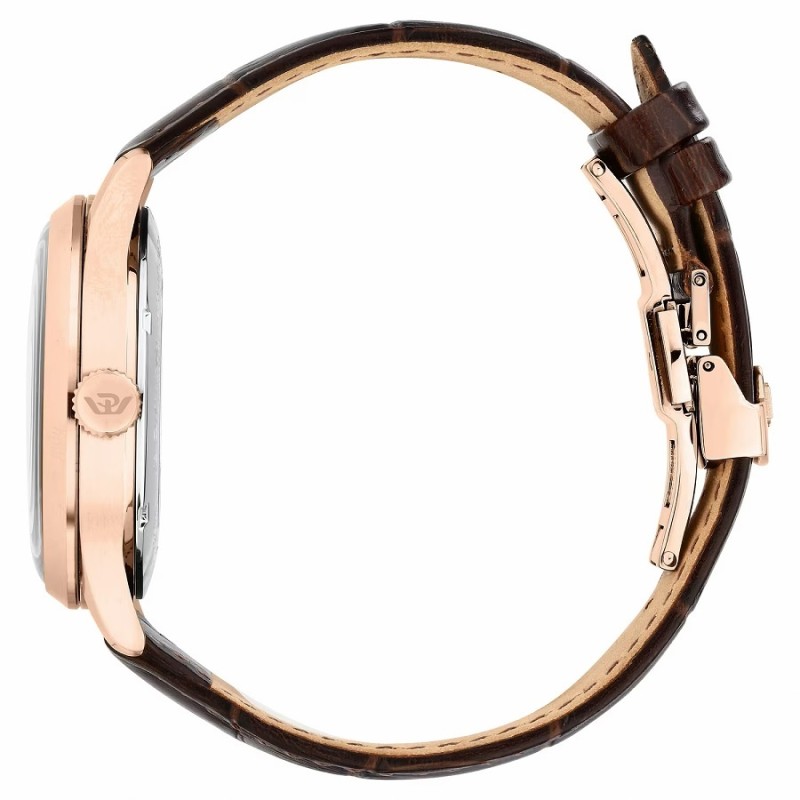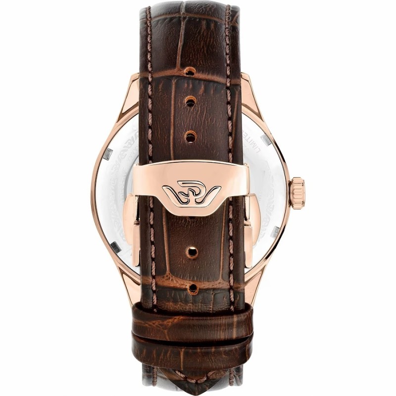 Orologio PHILIP WATCH solo tempo da Uomo della collezione MUSEUM LIMITED EDITION 500PZ con movimento automatico a riserva di carica SWISS MADE, cassa 40 mm in acciaio inox PVD rose gold finitura lucida e satinata, spessore della cassa 12.55 mm, quadrante analogico bianco, indici, con numeri arabi, e lancette di colore oro rosé, datario con finestrella ad ore 3, lancetta piccoli secondi ad ore9, contatore della riserva di carica ad ore 6, corona e fondello serrato a vite per una maggiore garanzia di impermeabilità, fondello con oblò centrale trasparente che consente di vedere il movimento dell’orologio e vetro K1 a doppia curvatura - Il cinturino è in elegante pelle marrone e monta una chiusura déployante in PVD rose gold con apertura a doppio pulsante - Orologio impermeabile a 3 ATM, quindi non si può immergere in acqua, ma resiste agli spruzzi e agli schizzi.