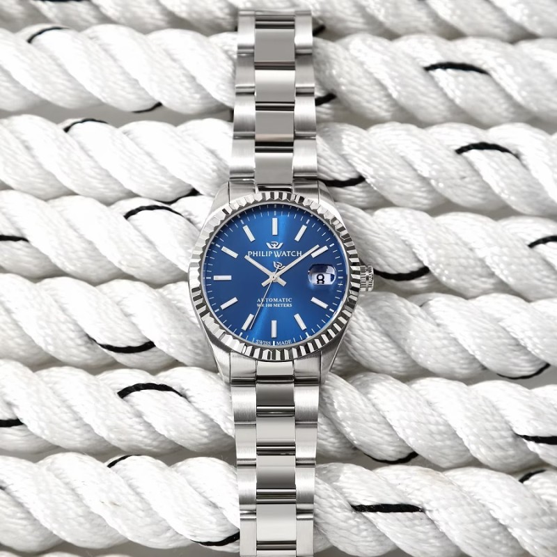 Orologio PHILIP WATCH solo tempo da Uomo della collezione CARIBE URBAN con movimento SWISS MADE automatico, cassa 39 mm in acciaio inox, lunetta con finitura zigrinata, spessore della cassa 11.00 mm, quadrante analogico blu, datario a finestrella con lente d’ingrandimento ad ore 3, indici a bastoni e lancette con inserto luminescente in modo che l'ora sia leggibile anche in condizioni di scarsa illuminazione, fondello serrato a vite per una maggiore garanzia di impermeabilità con oblò centrale in vetro che consente la vista del movimento dell’orologio e vetro zaffiro con trattamento antiriflesso - Il cinturino è in acciaio inox finitura lucida e satinata e monta una chiusura déployante con apertura a doppio pulsante e blocco di sicurezza - Orologio impermeabile a 10 ATM, quindi è adatto per il nuoto e le immersioni, ma non è adatto per le immersioni con pressione.