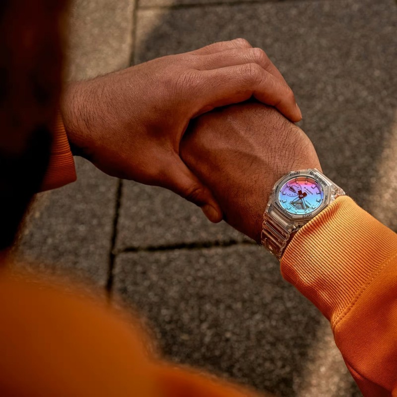 Se ti piacciono i colori e le tonalità cangianti, non potrai rinunciare alla nuova serie Iridescent, ispirata all'immaginario paradisiaco dei tropici e ai colori mutevoli del crepuscolo di mezza estate - Iridescent Color è la prima serie G-SHOCK ad avere sfumature arcobaleno dovute al riflesso della luce naturale del sole, grazie alla tecnica della deposizione dei vapori sul vetro del quadrante.