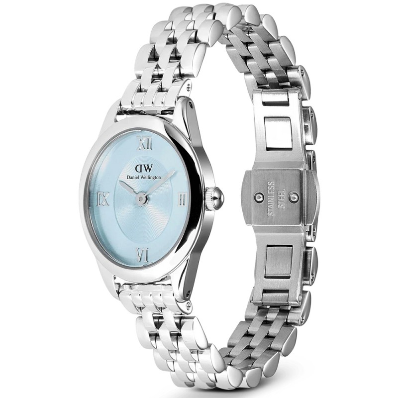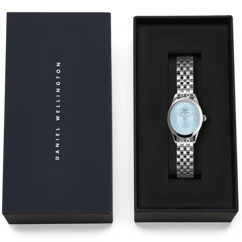 Orologio solo tempo da Donna della collezione DANIEL WELLINGTON OPHELIA MINI ICE BLUE SILVER con movimento al quarzo, cassa ovale 22.0 x 25.5 mm in acciaio inox, spessore della cassa 6.00 mm, quadrante analogico ice blue, indici con numeri romani e lancette di colore silver, vetro minerale e fondello serrato a pressione - Il cinturino è in acciaio inox con finitura lucida e monta una chiusura deployante con apertura a doppio pulsante - Larghezza Cinturino: 10 mm - Orologio impermeabile a 3 ATM, quindi significa che non si può immergere in acqua, ma che resiste agli spruzzi e agli schizzi - Garanzia Internazionale: 24 Mesi.