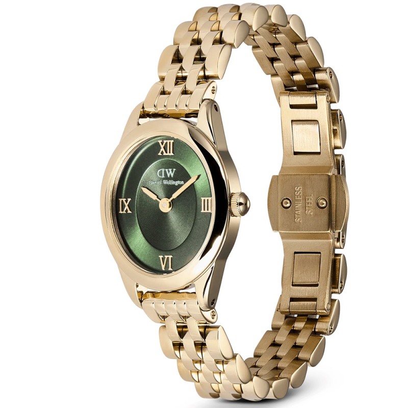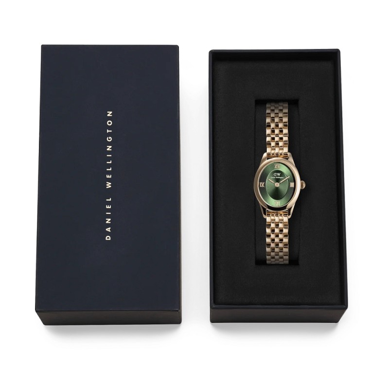 Orologio solo tempo da Donna della collezione DANIEL WELLINGTON OPHELIA MINI EMERALD GOLD con movimento al quarzo, cassa ovale 22.0 x 25.5 mm in acciaio inox PVD gold, spessore della cassa 6.00 mm, quadrante analogico verde, indici con numeri romani e lancette di colore oro, vetro minerale e fondello serrato a pressione - Il cinturino è in acciaio inox PVD gold finitura lucida e monta una chiusura deployante con apertura a doppio pulsante - Larghezza Cinturino: 10 mm - Orologio impermeabile a 3 ATM, quindi significa che non si può immergere in acqua, ma che resiste agli spruzzi e agli schizzi - Garanzia Internazionale: 24 Mesi.