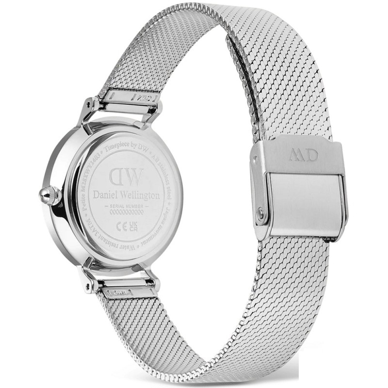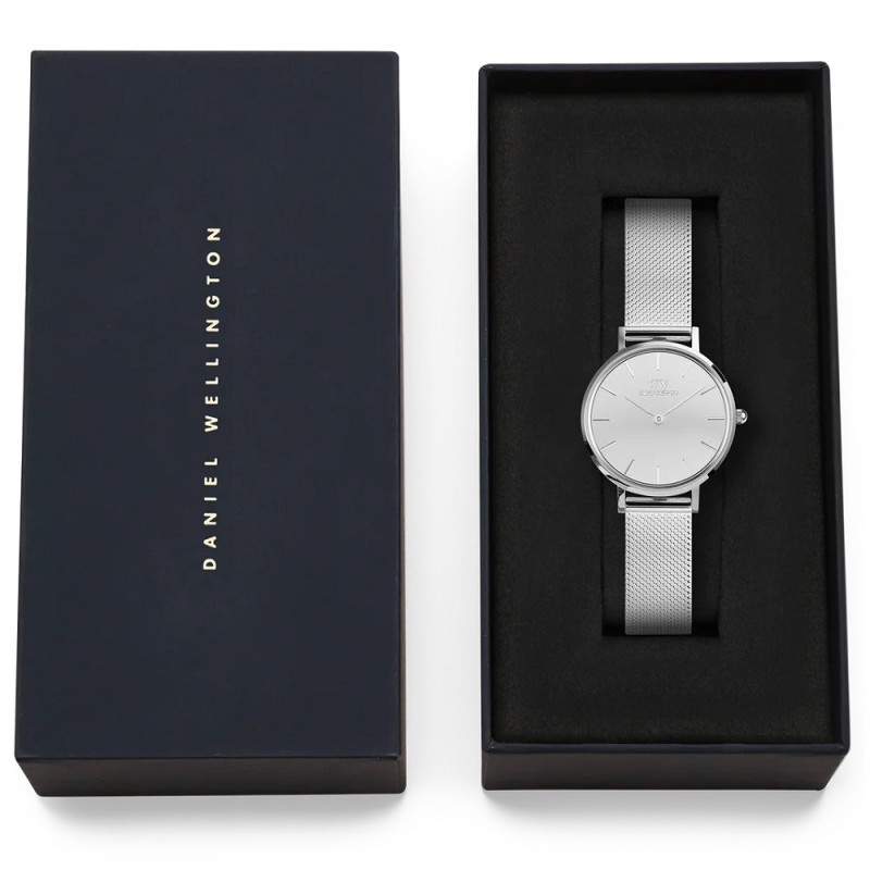 Orologio solo tempo da Donna della collezione DANIEL WELLINGTON PETITE REFLECTION SILVER con movimento al quarzo, cassa 28 mm in acciaio inox, spessore della cassa 6.00 mm, quadrante analogico silver a specchio con indici a bastoni e lancette di colore silver, vetro minerale e fondello serrato a pressione - Il cinturino, maglia milanese, è in acciaio inox e monta una chiusura scorrevole e regolabile con gancio a scatto e blocco di sicurezza - Lunghezza Regolabile: da 13.0 a 20.0 cm - Larghezza Cinturino: 12 mm - Orologio impermeabile a 3 ATM, quindi significa che non si può immergere in acqua, ma che resiste agli spruzzi e agli schizzi - Garanzia Internazionale: 24 Mesi.