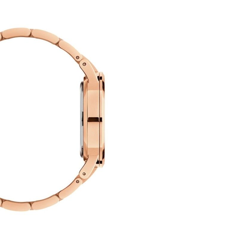 Il quadrante è di colore bianco con indici a bastone, lancette di colore oro rosa e vetro minerale. Collezione: Iconic Link.