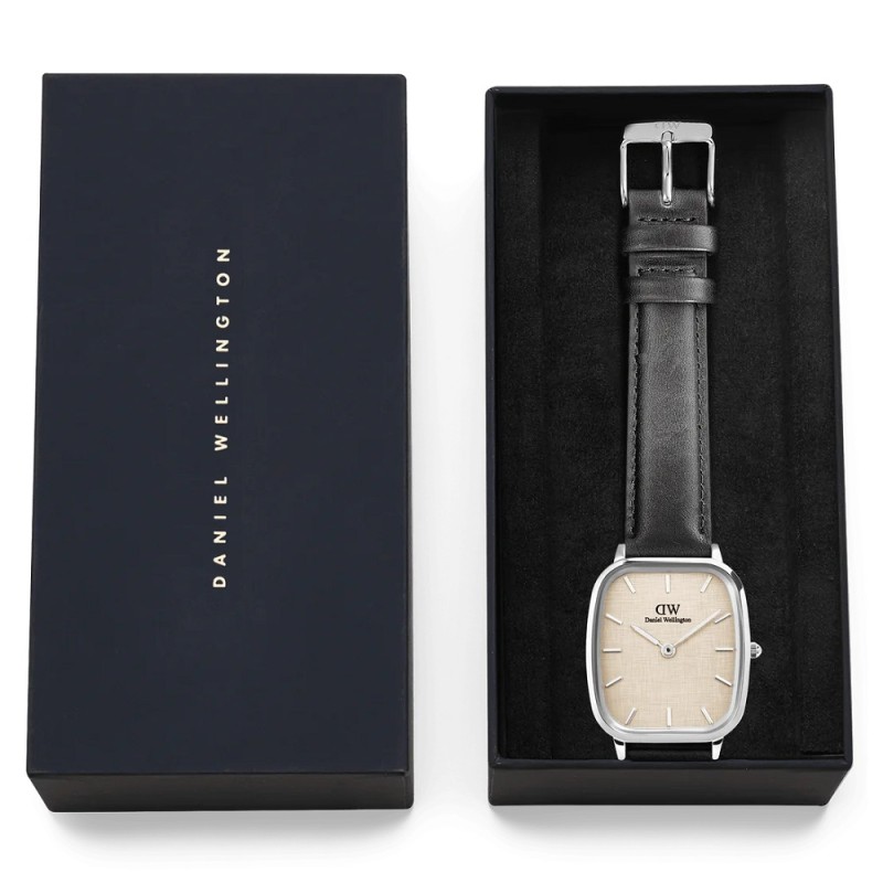 Orologio solo tempo da Uomo della collezione DANIEL WELLINGTON MARLON SHEFFIELD LINEN SILVER con movimento al quarzo, cassa rettangolare 32.0 x 36.3 mm in acciaio inox, spessore della cassa 6.00 mm, quadrante analogico in lino beige, indici e lancette di colore silver, fondello serrato a pressione e vetro minerale - Il cinturino è in morbida pelle di colore nero e monta una chiusura con fibbia ad ardiglione in acciaio - Larghezza Cinturino: 17 mm - Orologio impermeabile a 3 ATM quindi non si può immergere in acqua, ma resiste agli spruzzi e agli schizzi - Garanzia Internazionale: 24 Mesi.
