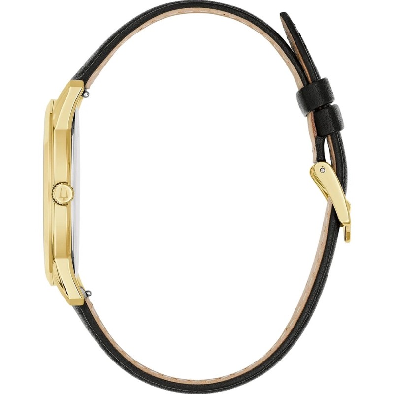 Orologio BULOVA solo tempo da Uomo della collezione CLASSIC con movimento al quarzo, cassa 40 mm in acciaio inox PVD gold, spessore della cassa 7.00 mm, quadrante analogico silver, indici, a bastoni alternati con numeri arabi, e lancette di colore oro, datario con finestrella ad ore 3, fondello a pressione e vetro minerale convesso - Il cinturino è in elegante pelle di colore nero e monta una chiusura con fibbia ad ardiglione in acciaio PVD gold - Orologio impermeabile a 3 ATM, quindi significa che non si può immergere in acqua, ma che resiste agli spruzzi e agli schizzi.