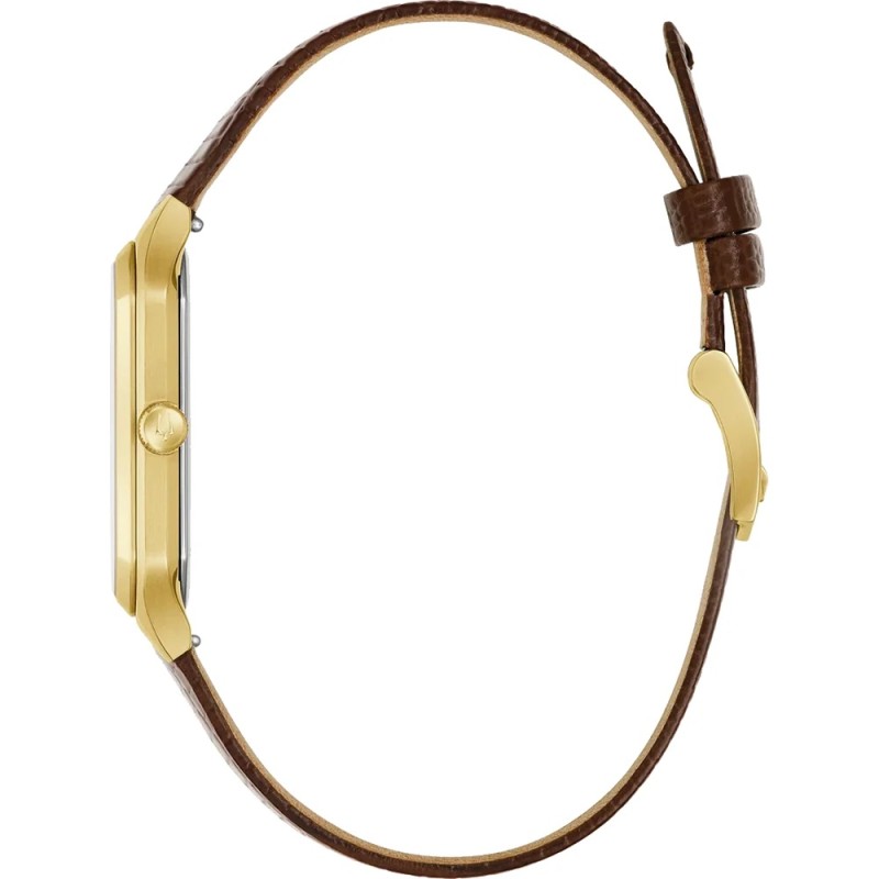 Orologio BULOVA solo tempo da Uomo della collezione CLASSIC TONY BENNETT SPECIAL COLLECTION con movimento al quarzo, cassa rettangolare 32 mm in acciaio inox PVD gold, spessore della cassa 7.00 mm, quadrante analogico nero con indici e lancette di colore oro, datario con finestrella ad ore 3, fondello firmato Tony Bennett e con incisa la scritta “ WE ARE ALL HERE” e vetro zaffiro con trattamento antiriflesso - Il cinturino è in elegante pelle di colore marrone e monta una chiusura con fibbia ad ardiglione in acciaio PVD gold - Orologio impermeabile a 3 ATM, quindi significa che non si può immergere in acqua, ma che resiste agli spruzzi e agli schizzi.