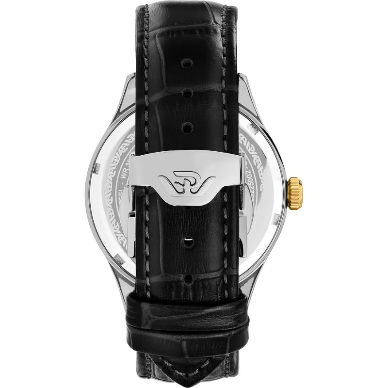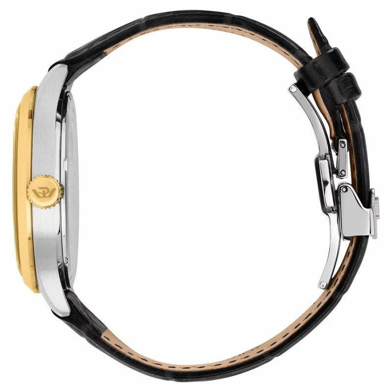 Orologio PHILIP WATCH solo tempo da Uomo della collezione MUSEUM con movimento al quarzo SWISS MADE, cassa 40 mm in acciaio inox, spessore della cassa 11.20 mm, lunetta in PVD gold con finitura lucida, quadrante analogico champagne, indici, con numeri arabi e lancette di colore oro, datario con finestrella ad ore 3, fondello serrato a vite per una maggiore garanzia di impermeabilità e vetro K1 a doppia curvatura - Il cinturino è in elegante pelle nera e monta una chiusura déployante con apertura a doppio pulsante - Orologio impermeabile a 3 ATM, quindi non si può immergere in acqua, ma resiste agli spruzzi e agli schizzi.