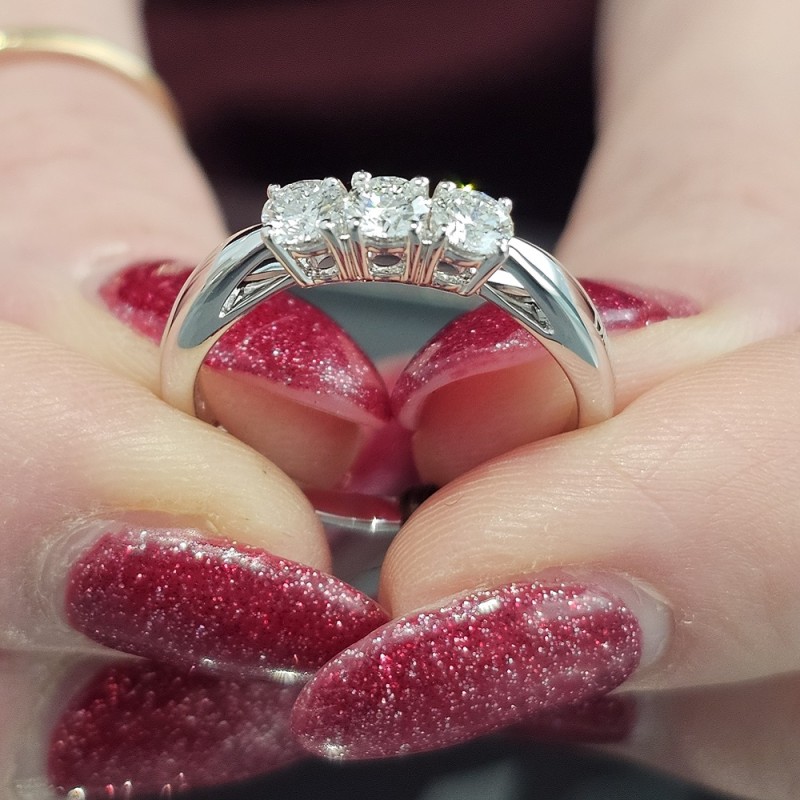 Gioiello da Donna della collezione DAMIANI CUPIDO realizzato in oro bianco 750 (18KT) - L’anello, modello trilogy, è impreziosito da tre luminosi diamanti taglio brillante per una caratura complessiva di 0,57 ct - Diamanti G color - Misura Anello: 15 - Garanzia Internazionale: 24 Mesi.